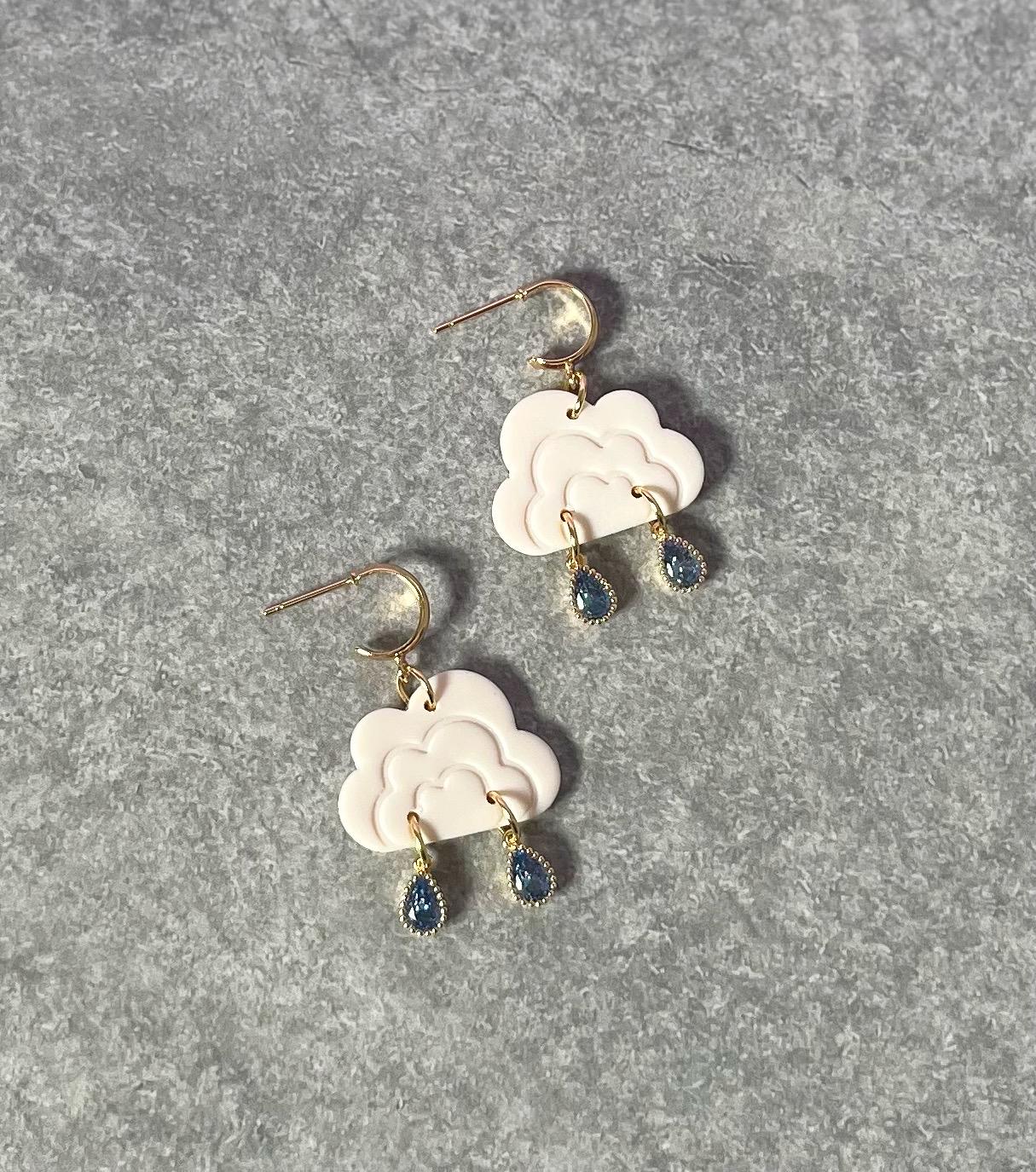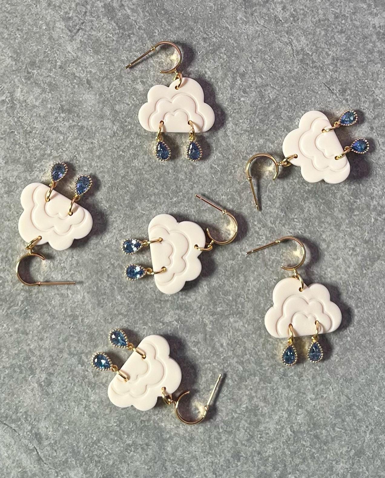 -Clay/charm pieces featured: Cream mod clouds, light blue gold plated teardrop gem charms