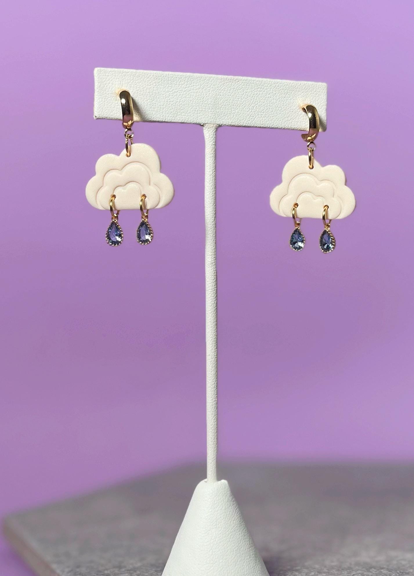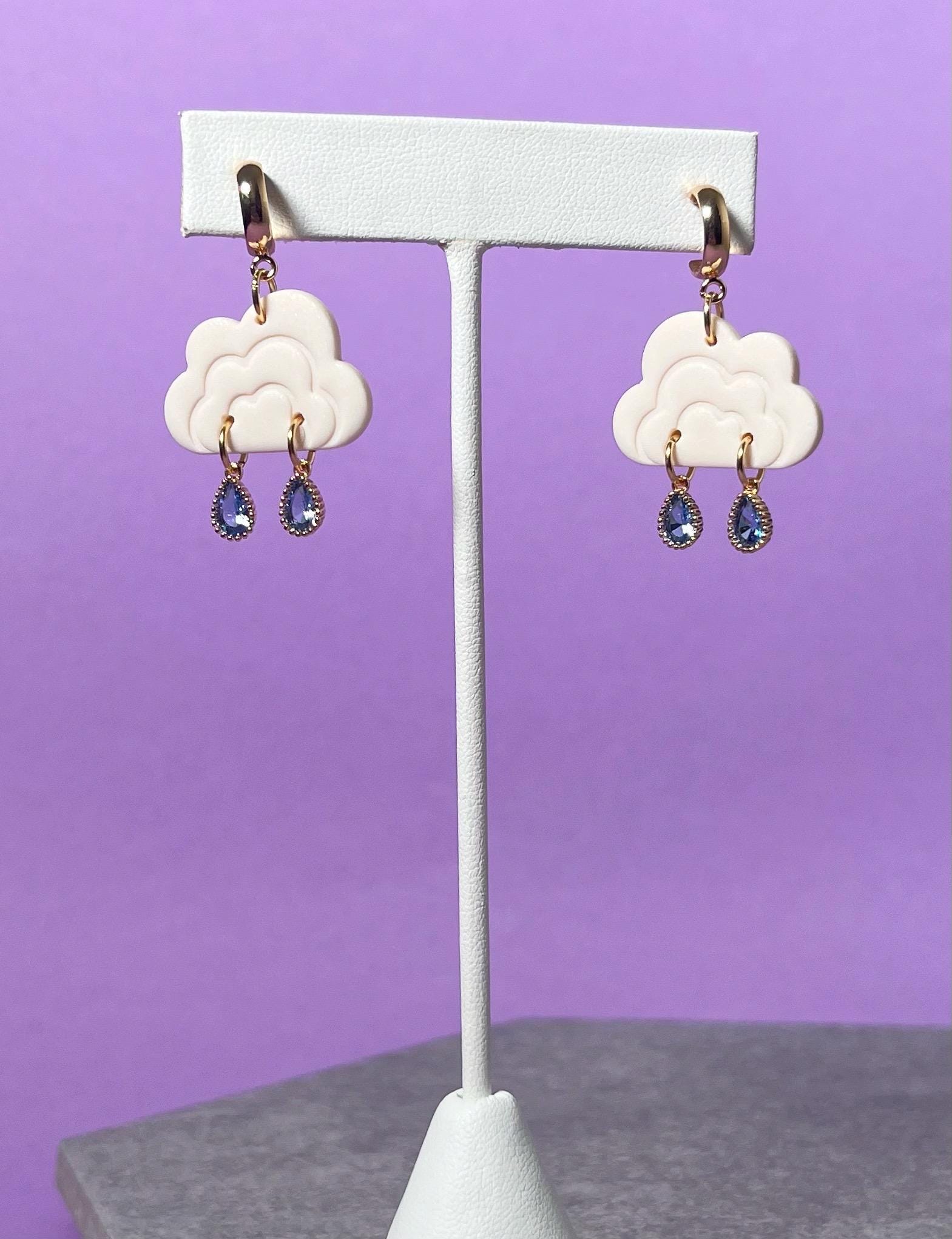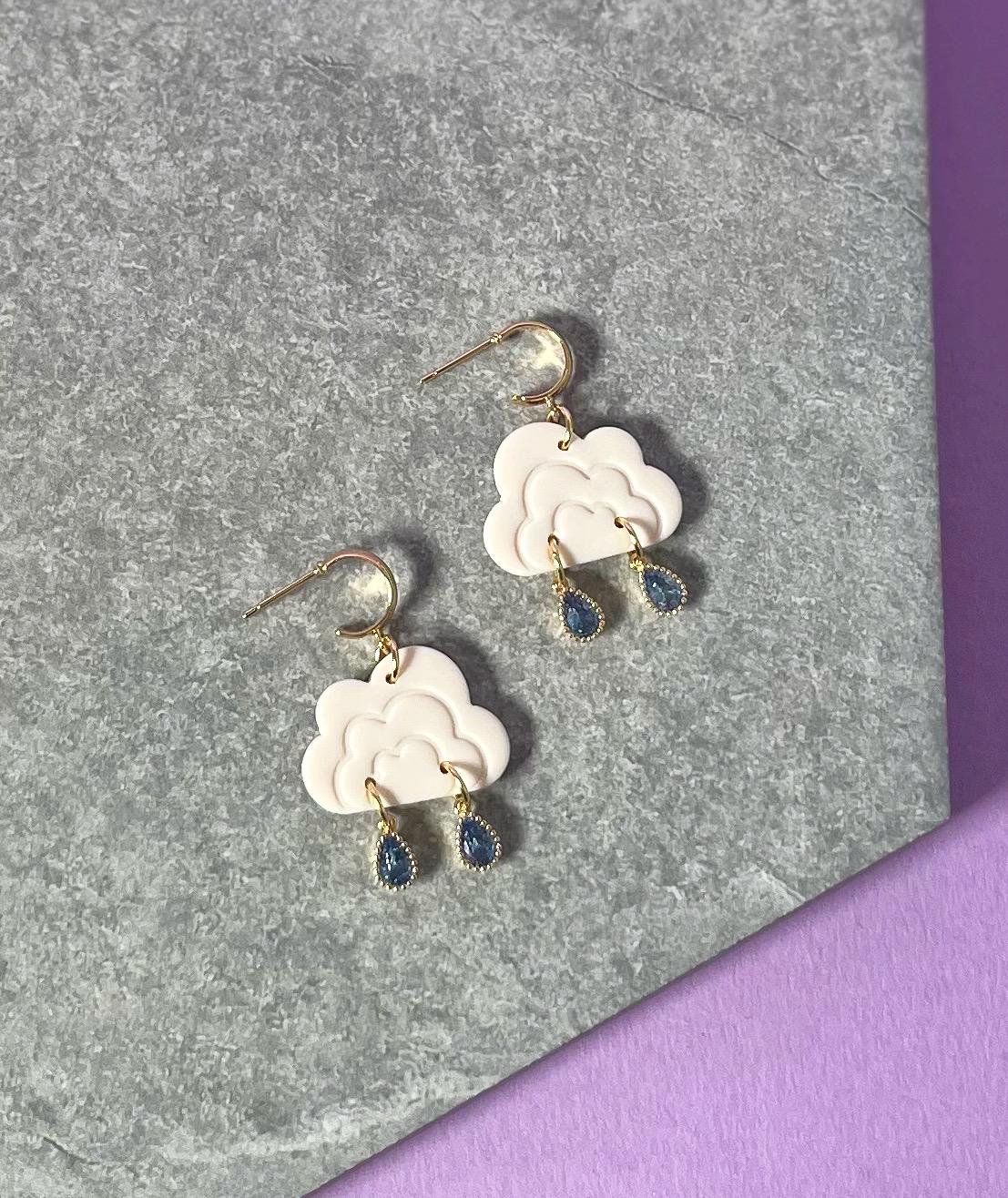 Handmade Rain Cloud Earrings, Polymer Clay, Raindrops, Spring Huggie Hoops