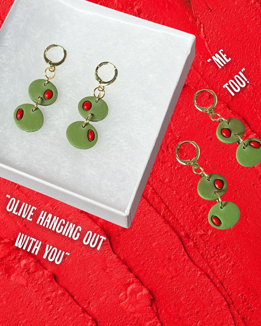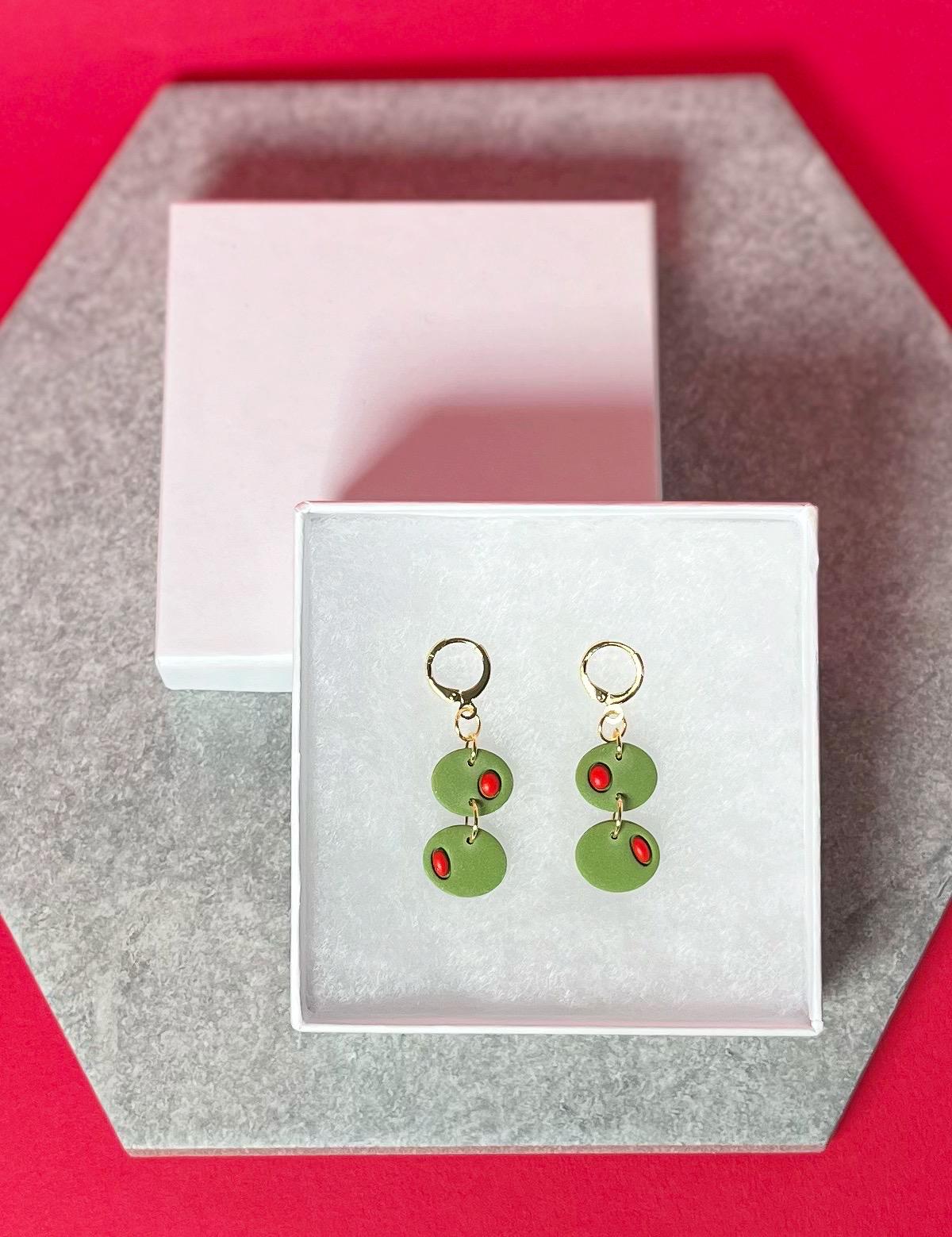-Clay pieces featured: 2 green olive shapes with red liquid clay detail
