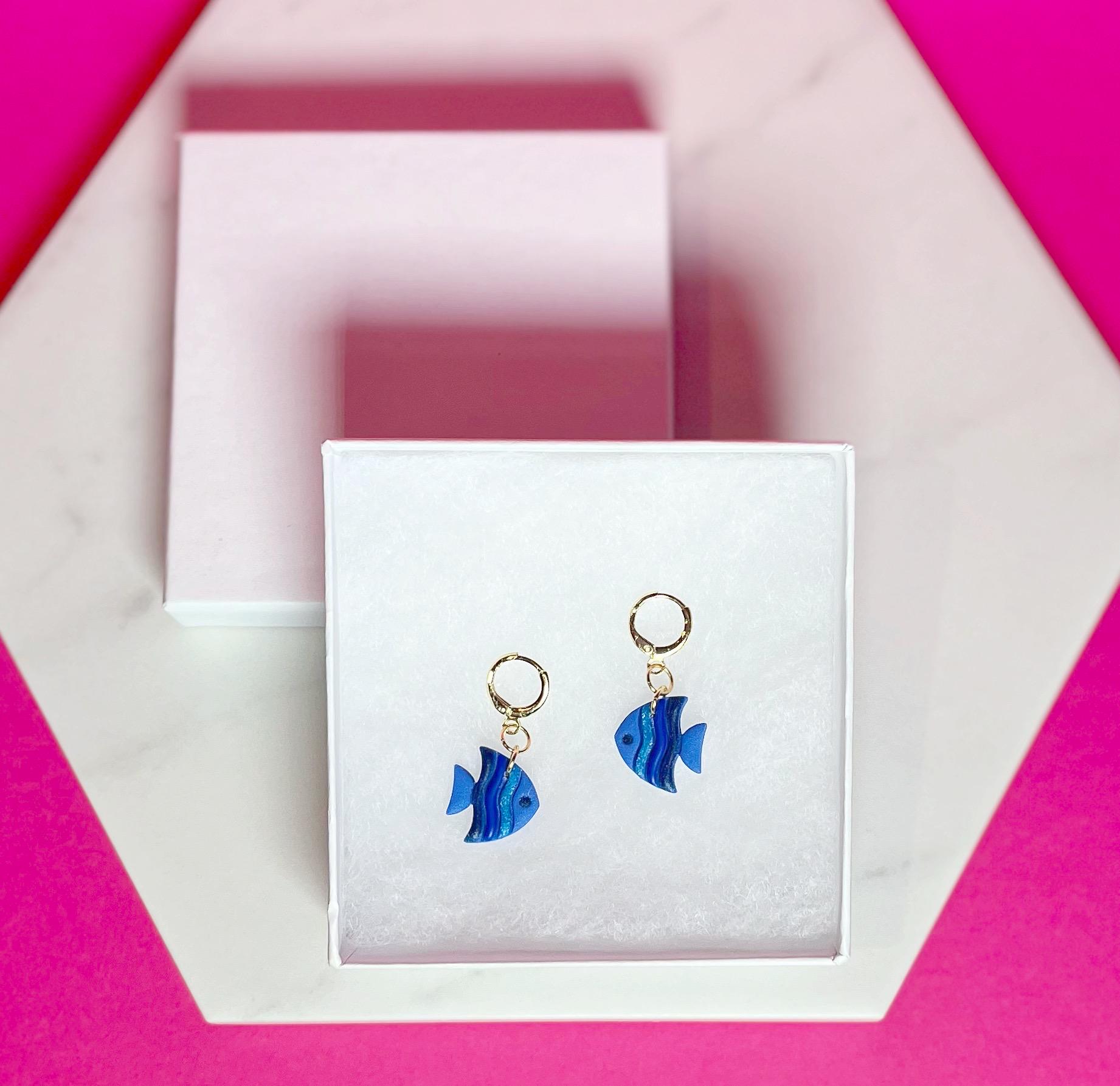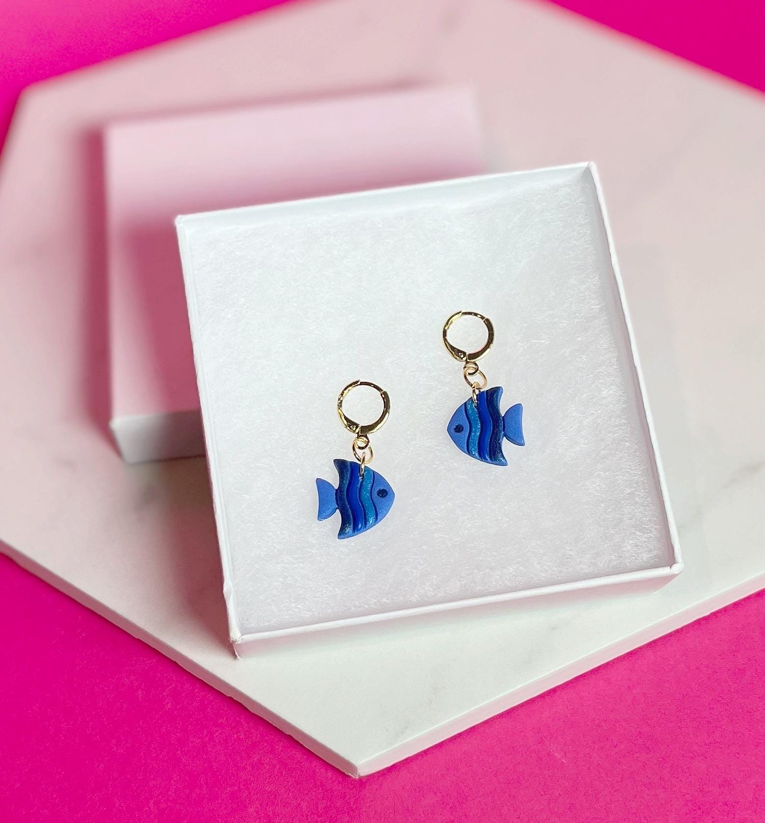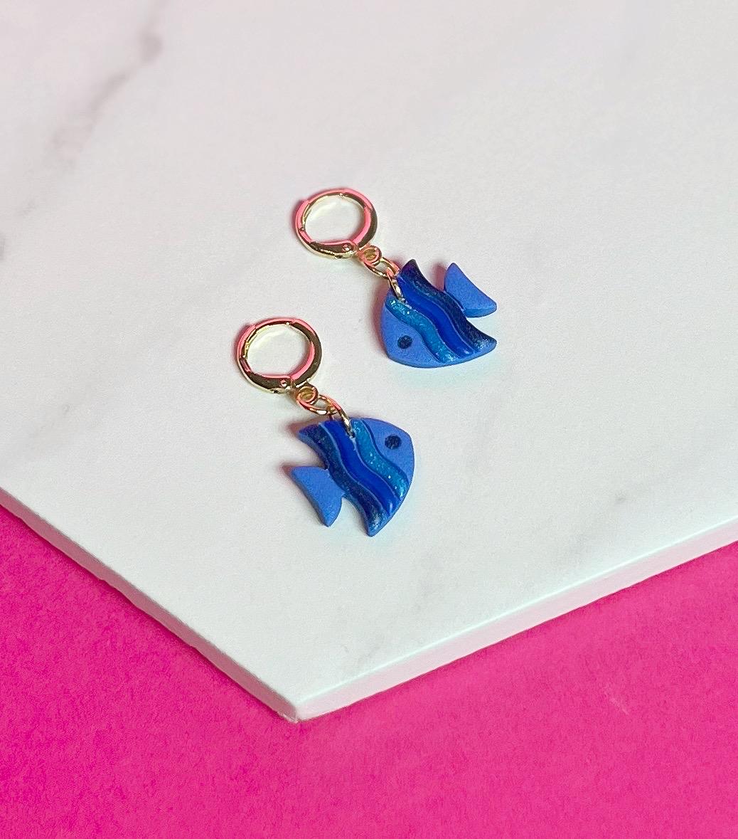 Mini Fish Huggie Hoop Earrings, Blue Dainty Polymer Clay Earrings